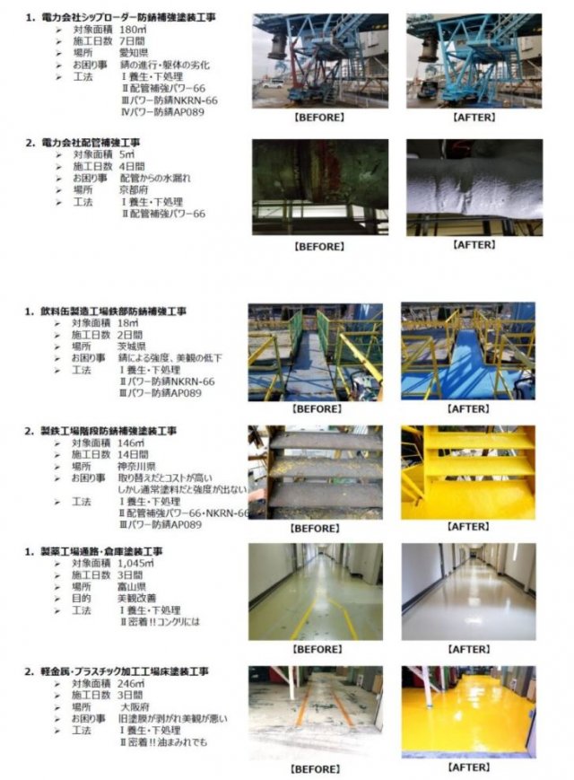 この様な特殊技術を持った塗装により、錆で劣化が進んだ階段、配管、タンク等、また油汚れの多い工場の床、厨房の床など、美観を保つだけでなく補強と延命化が可能となります。特に錆による劣化は環境面、安全面においても対策が必要になります。更新より手軽に計画ができるので施工が可能であれば断然お勧めの対策となります。