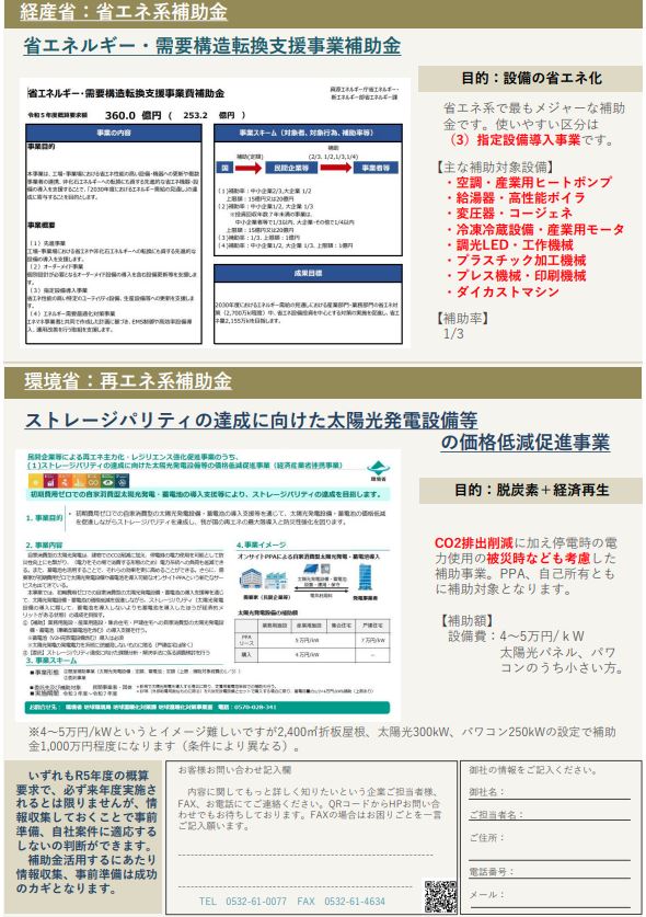 経産省の省エネ補助金、(3)指定設備導入事業はR4年度の補正予算にて実施予定です。